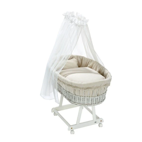 Der Alvi Birthe Stubenwagen bietet noch mehr Komfort fürs Baby: Der extra große Korb aus handgeflochtener Weide sitzt auf einem Untergestell aus vollmassiver Kiefer und ist durch seine vier gebremsten Rollen sicher und flexibel. Der Alvi Birthe Stubenwagen wird mit Himmelstange, Matratze und Garnitur geliefert und bietet einen zauberhaften und kuscheligen Schlafplatz.