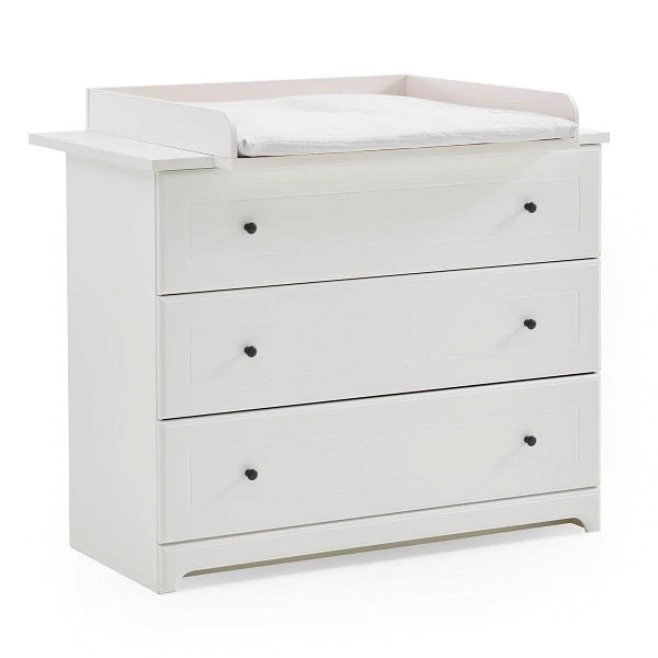 Wickelaufsatz geliefert. Die drei großen Schubkästen mit Mitteltrennsteg und Self-Soft-Close-Funktion bieten viel Stauraum. Mit der pflegeleichten Melamin-Oberfläche und dem 25 mm starken Oberboden ist die Kommode besonders langlebig und stabil.