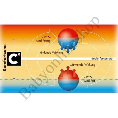 Eingebettete Mikrokapseln reagieren auf Veränderungen von Körper- und Raumtemperatur. Wenn die Temperatur über den Idealwert liegt, werden die im Comfortemp Vlies befindlichen Mikrokapseln flüssig und erzeugen einen Kühleffekt. Sinkt die Temperaturwieder, gehen die Mikrokapseln von der flüssigen in die feste Phase über, setzen dabei Wärmeenergie frei und halten so den Körper auch bei niedrigen Temperaturen angenehm warm.