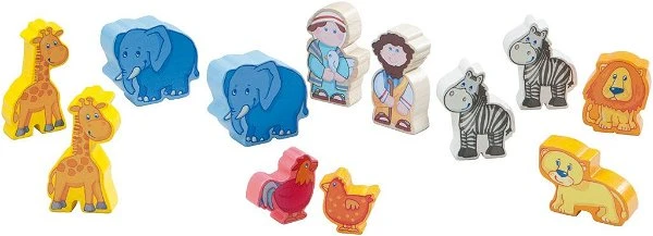 Inhalt: Noah, seine Frau, 2 Elefanten, 2 Zebras, 2 Giraffen, 2 Löwen, 1 Hahn, 1 Henne, 1 Arche, 1 Treppe