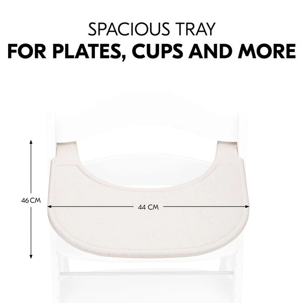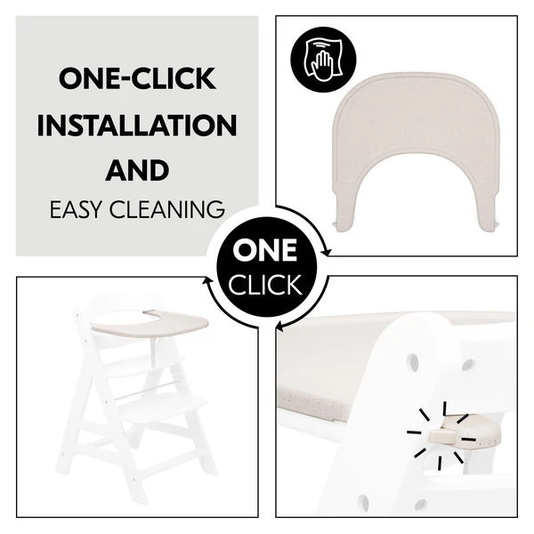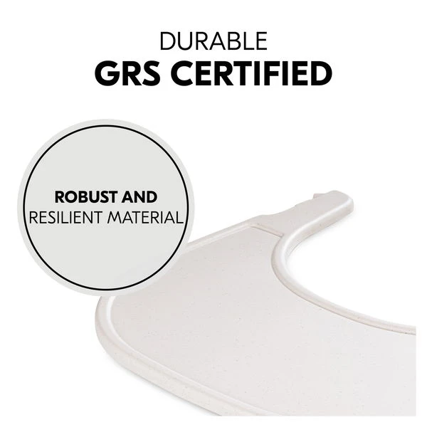 Das Essbrett wird aus recyceltem Material gefertigt, das nach dem Global Recycled Standard (GRS) zertifiziert ist. Das steht für klare soziale, ökologische und chemische Produktionsvorschriften. Das Tablett kannst du ganz einfach über einen Klick an den Hochstuhl montieren. Dieser eigene Tisch gibt deinem Kind von 6 bis 36 Monaten mehr individuellen Freiraum. Die glatte Oberfläche kannst du schnell mit einem Tuch und herkömmlichen Reinigungsmitteln sauber wischen.