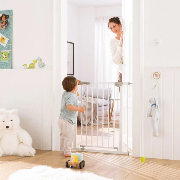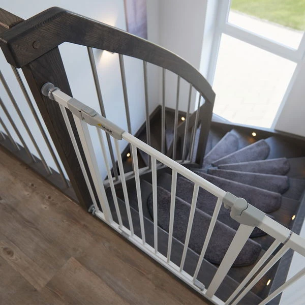 Die Tür des Gitters lässt sich bequem und mit nur einer Hand in beide Richtungen öffnen. So ist die andere Hand für das Baby oder Einkaufstaschen frei. Nach dem Hindurchgehen fällt die Tür automatisch wieder sicher zu, was auch der Farbindikator als zusätzliche Sicherheit bestätigt. Damit die Tür auch bei kleinen Kinderhändchen geschlossen bleibt, verfügt das Gitter über einen zweifachen, kindersicheren Verschluss, den nur Erwachsene bedienen können.