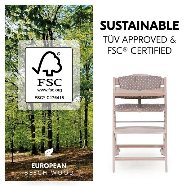Für Sicherheit sorgen der 5-Punkt-Gurt und der Schrittgurt, welche mit dem anderen Zubehör kompatibel sind. Auf dem großzügigen Holztisch hat dein Kind individuellen Freiraum zum Essen und Spielen. Alternativ kannst du den Tisch gegen den Vorderbügel austauschen und den Stuhl unter fast jeden Tisch schieben. Die im Set enthaltene Hochstuhlauflage besteht aus einem weichen Kissen für Rückenlehne und Sitz, welche deinem Kind erhöhten Sitzkomfort beim Essen und Spielen bieten.