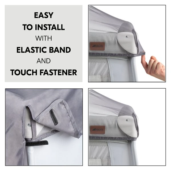 Sowohl zu Hause als auch unterwegs lässt sich der Sonnen- und Insektenschutz leicht am Reisebett befestigen. Dank eines elastischen Bundes und praktischen Klettverschlüssen ist die Montage ein Kinderspiel. Zusätzliche Stabilität bietet die flexible Mittelstrebe, die bei Bedarf zusammengeklappt und verstaut werden kann. Das Verdeck ist optimal für hauck Reisebetten mit einer Liegefläche von ca. 120 x 60 cm geeignet.