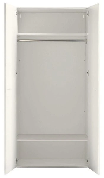Der Kleiderschrank ist mit 2 Türen ausgestattet. Innen befinden sich 2 Einlegeböden und 1 Kleiderstange.