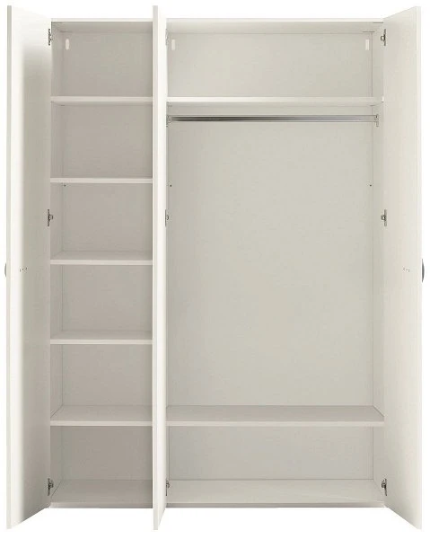 Der Kleiderschrank ist mit 3 Türen ausgestattet und innen befinden sich links 5 Einlegeböden, rechts 2 Einlegeböden und 1 Kleiderstange.
