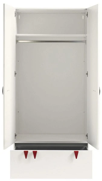 Der Kleiderschrank ist mit 3 Türen und 1 Schublade ausgestattet. Innen befinden sich links 4 Einlegeböden, rechts 1 Einlegeboden und 1 Kleiderstange.