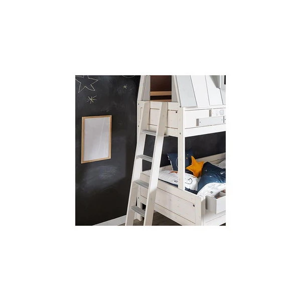 Das LIFETIME Etagenbett My Hangout ist aus massiver astfreier Kiefer hergestellt. Dadurch treten keine Verfärbungen auf, die man von Astlöchern her kennt. Die Oberfläche ist mit einem weißen Möbellack auf Wasserbasis behandelt worden.