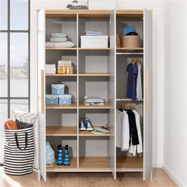 Der Kleiderschrank ist mit 3 Türen ausgestattet. Der Innenraum ist durch zwei Mittelwände unterteilt. Rechts befinden sich 1 Einlegeboden und 2 Kleiderstangen, Links und in der Mitte befinden sich jeweils 4 Einlegeböden.