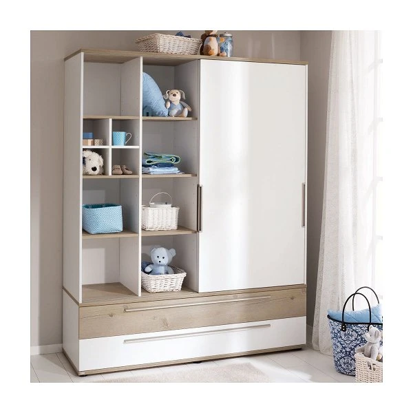 Der Paidi Carlo Schiebetürenschrank ist mit 2 Schiebetüren, 2 Schubkästen und 2 Mittelwänden ausgestattet. Links befinden sich 2×3 Einlegeböden, rechts ein Einlegeboden und 2 Kleiderstangen. Die großen Schubkästen bieten viel Stauraum und und haben jeweils eine Front in Fichte-Vintage-Nachbildung und in kreideweiß.