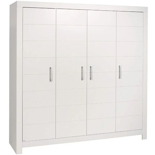 Der Paidi Fiona Kleiderschrank ist mit modernen Fronten in Kassettenoptik gestaltet. Alu-Griffe unterstreichen den schlichten, edlen Look. Der Innenraum ist durch zwei Mittelwände unterteilt. Rechts und links befinden sich jeweils 4 Einlegeböden. In der Mitte befinden sich 2 Kleiderstangen und 2 breite Einlegeböden.
