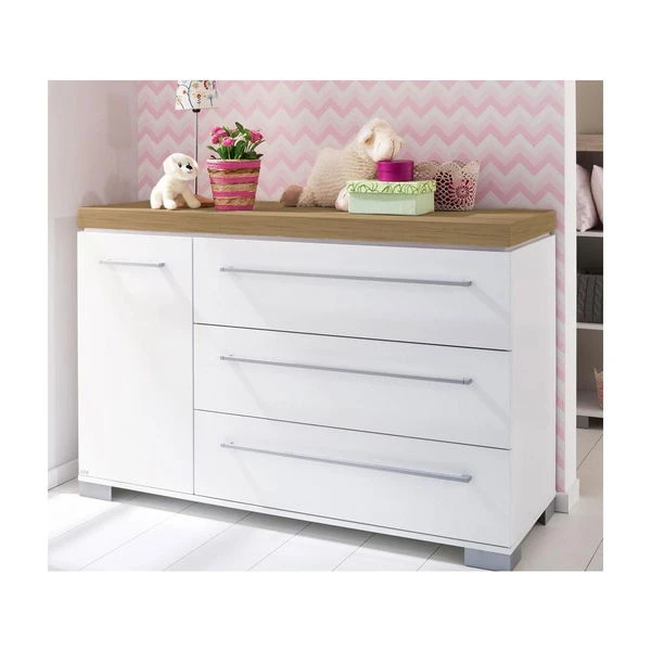 Die Paidi Kira Kommode ist mit 3 Schubkästen ausgestattet. Die Deckplatte der Paidi Kira Kommode ist 60 mm stark. Der im Preis enthaltene Wickelaufsatz bietet eine Wickelfläche von 94,4 x 78,7 cm.