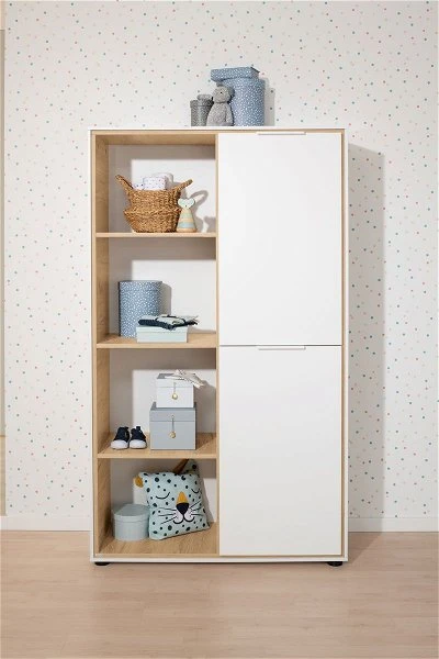 Das Paidi Lieven Regal hat einen Korpus in kreideweiß. Die Fächereinteilungen sind als gedoppelter Rahmen ausgeführt und in Eiche-Montana-Nachbildung abgesetzt. Die rechte Seite ist mit 2 Türen mit kreideweißen Fronten geschlossen.