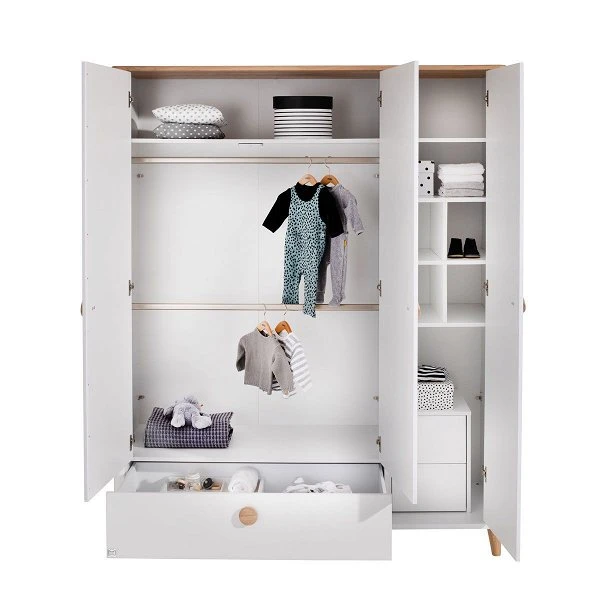 Der Paidi Lotte & Fynn Kleiderschrank ist mit 3 Türen und 1 Schubkasten ausgestattet. Der Innenraum ist durch eine Mittelwand unterteilt. Rechts befinden sich 4 schmale Einlegeböden. Links finden Sie einen breiten Einlegeboden und 2 breite Kleiderstangen.