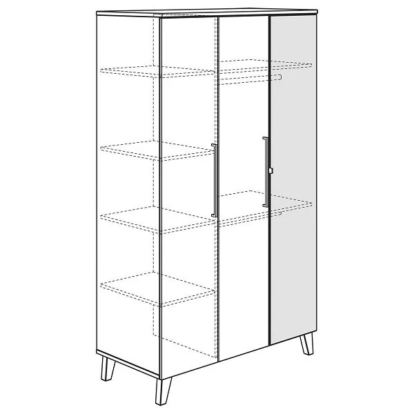 Der Kleiderschrank ist mit 3 Türen ausgestattet. Der Innenraum ist durch eine Mittelwand unterteilt. Rechts befinden sich 2 breite Einlegeböden und 2 breite Kleiderstangen, Links befinden sich 4 Einlegeböden.