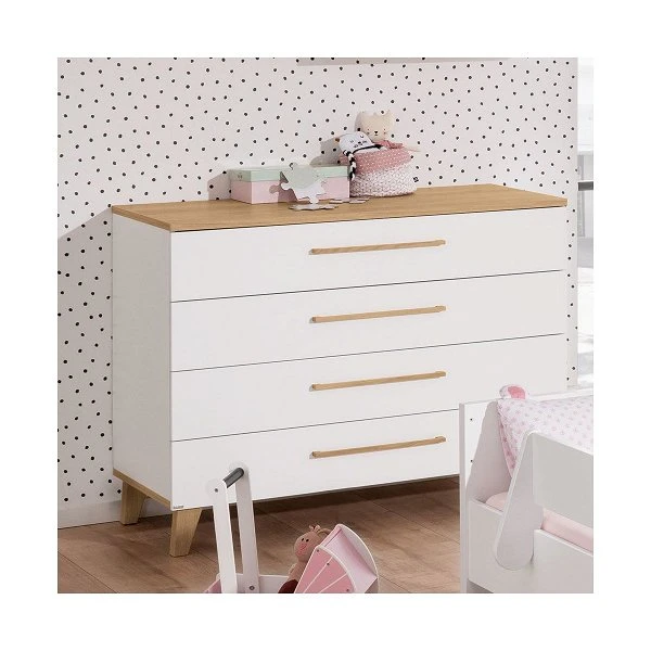 Die Paidi Oscar Kommode bringt den reduzierten „Scandinavian Look“ ins Kinderzimmer. Sie ist mit 4 großen Schubkästen mit Facheinteilungen ausgestattet. Der obere Schubkasten besitzt einen Vollauszug, damit der gesamte Inhalt eingesehen werden kann.