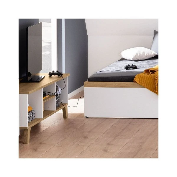 Das Lowboard hat 3 offene Fächer. In den beiden äußeren Fächern befinden sich die Kabeldurchlässe, das mittlere Fach ist mit einem Fachboden unterteilt.