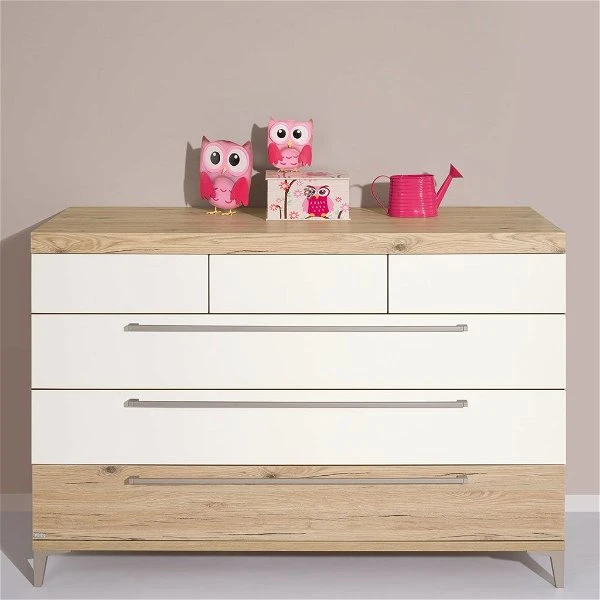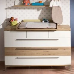 Die Paidi Remo Wickelkommode kombiniert trendiges Kreideweiß mit einem warmen Eiche-Bordeaux-Dekor und schafft in jedem Kinderzimmer eine gemütliche Atmosphäre. Die breiten Griffe und formschönen Füße in einem farblich harmonierenden Nickelton unterstreichen die moderne und dennoch zeitlose Optik