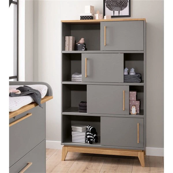 Das Paidi Sten Regal hat einen schlichten, edlen Look. Der Korpus ist in schiefergrau gehalten und der Sockel, die Griffe und die Deckplatte sind aus massiver Eiche. Die 4 Schiebetüren verdecken 4 der 8 offenen Fächer und lassen sich pro Fachreihe individuell verschieben.