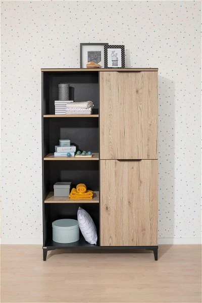 Der naturschwarze Korpus des Paidi Tomke Regal und die Einlegeböden und Türfronten in Eiche-Bordeaux bilden einen tollen Kontrast. Die zweifarbige Deckplatte und die Füße und Griffe aus gebürstetem Metall unterstreichen den industriellen Look. Dieses Regal bietet Ihnen ausreichend Stauraummöglichkeiten – im Kinder- und später auch im Jugendzimmer.