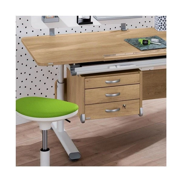Frei stehend oder links bzw. rechts hängend am Schreibtisch montiert – der Universalcontainer macht immer eine gute Figur. Drei Schubkästen bieten Platz für Stifte, Hefte & Co. und im oberen Schubkasten findet sich eine flache Utensilienschale für allerlei Kleinkram. Er kann platzsparend unter die Tischplatte montiert werden (auch noch nachträglich) oder mit den im Lieferumfang enhaltenen Teppichrollen versehen werden und neben dem Schreibtisch zum Einsatz kommen. Wichtige Sachen können in dem unteren, abschließbaren Schubkasten untergebracht werden.