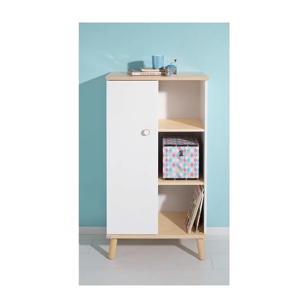 Das Paidi Regal hat 4 Fachböden in Birke natur, die Mittelwand ist kreideweiß. Die linke Seite des Regals kann mit einer Tür verschlossen werden. Deckplatte, Sockel und Füße sind aus massiver Birke.