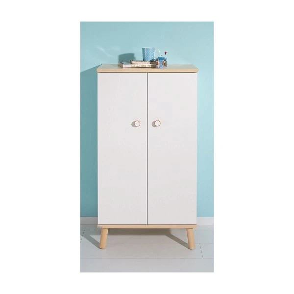 Das Paidi Regal hat hinter den Türen jeweils 2 Fachböden in Birke natur, die Mittelwand ist kreideweiß. Deckplatte, Sockel und Füße sind aus massiver Birke gefertigt.