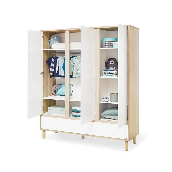 Der Pinolino Flow Kleiderschrank zaubert eine helle und einladende Atmosphäre ins Kinderzimmer. Die Kombination aus Esche Dekor mit Echtholzstruktur und klassischem Weiß sorgt in Kombination mit den angeschrägten Griffmulden für eine zeitlose Gemütlichkeit.
