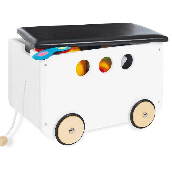 Die Pinolino Puppenwiege Jim hat viel Platz für die Lieblingsspielsachen, hier sind sie ordentlich verstaut und man kann sie mit der Zugschnur überall hin mitnehmen. Der gepolsterte Kunslederdeckel eignet sich auch gut als Sitzgelegenheit und hält bis zu 20 kg aus. Die Spielzeugkiste Jim ist aus robustem MDF gefertigt und weiß lackiert.