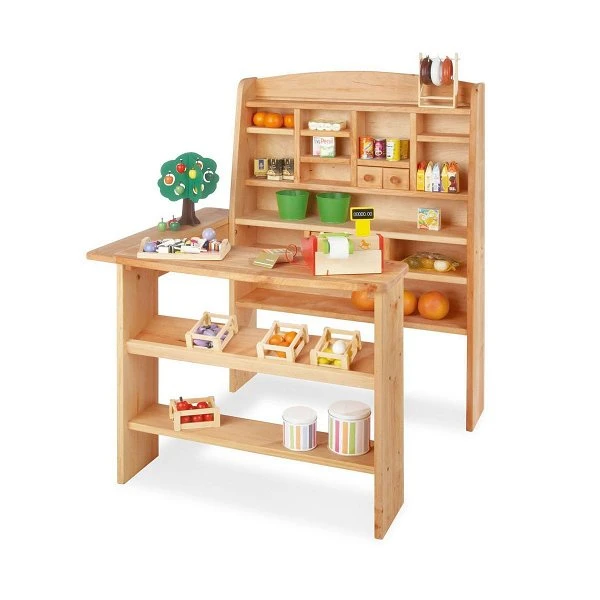 Der Pinolino Kaufladen Emma wird in unbehandeltem Erle Massivholz hergestellt. Die Rückwand ist in Erlensperrholz gefertigt. Im Lieferumfang sind zwei große und zwei kleine Schubladen enthalten. Hier findet der Pinolino Kaufladenbesitzer seine Erfüllung.