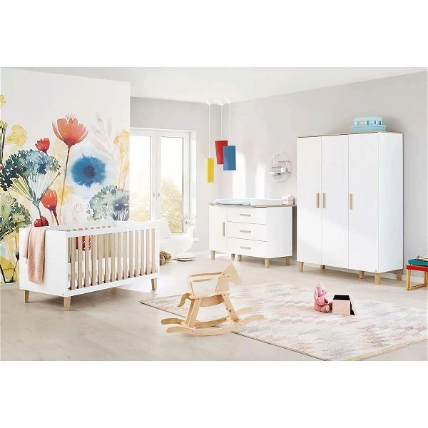 Das Pinolino Lumi Kinderzimmer bietet eine Kombination von klarem Weiß und der Eiche-Echtholzstruktur, so passt es perfekt zu einer modernen Einrichtung. Die hochwertigen Möbelfüße aus massiver Eiche runden das Gesamtbild ab.