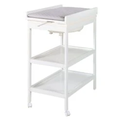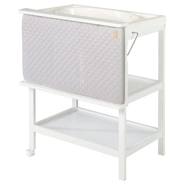 Diese praktische Roba Bade-Wickel-Kombination ist aus Holz natur in dem ansprechendem Dekor Buche gefertigt. Die Badewanne kann bei Bedarf hochgeklappt werden und nach dem Baden wieder an der Seite des Wickeltischs verschwinden. Mit einem Handgriff lässt sie sich vom Wickeltisch in eine Waschmöglichkeit verwandeln. Die textilbezogene Wickelauflage ist mit unbedenklichem PU (Polyurethan) beschichtet und somit hautfreundlich, abwaschbar und pflegeleicht. Der Ablaufschlauch der Wanne ermöglicht es auf einfache Weise, das Badewasser abzuleiten, ohne die Wanne zu bewegen. Zusätzlich besitzt die Roba Bade-Wickel-Kombination zwei Stoffablagefächer, um alle notwendigen Utensilien verstauen zu können.