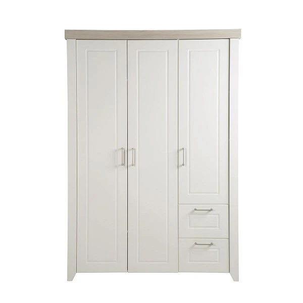 Der Kleiderschrank Felicia ist mit 3 Türen und 2 Schubladen ausgestattet. Innen befindet sich 5 Einlegeböden und 1 Kleiderstange.