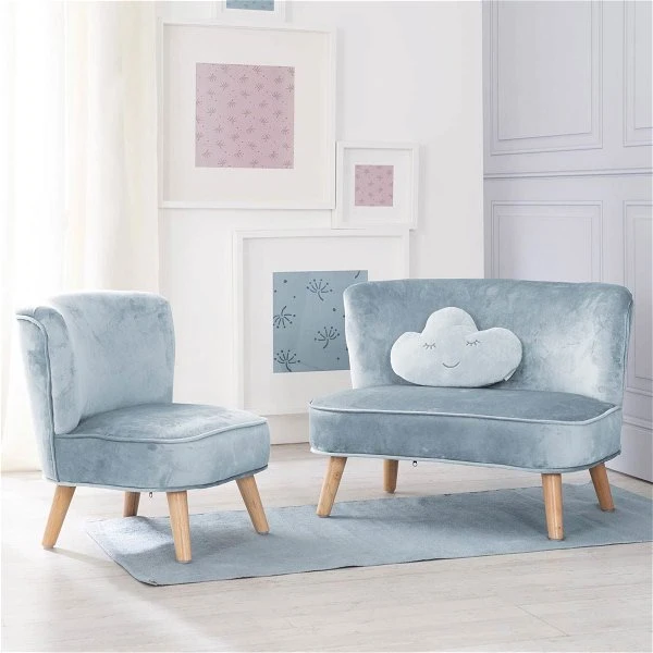 Das Roba Lil Sofa Set groß besteht aus einem Kindersofa, einem Kindersessel und einem Dekokissen in Wolkenform in der Farbe türkis. Der Kindersessel und das Kindersofa sind im trendigen Retro-Look und mit Samtstoff bezogen. Die Kindermöbel stehen auf stabilen Holzfüßen. Dank der niedrigen Sitzhöhe von 27 cm können bereits Kinder ab 18 Monaten auf ihnen platz nehmen. Auf dem Kindersofa finden bequem zwei Kinder Platz. Das roba Kuschelkissen in Form einer Wolke ist angenehm weich.