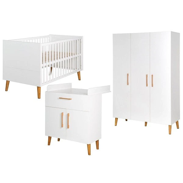 Das roba Kinderzimmer Mick ist im trendigen skandinavischen Stil gehalten. Das Kinderbett verfügt über 3 höhenverstellbare Liegepositionen. Im Kleiderschrank können Sie die gesamte Kleidung für Ihr Kind unterbringen. Die Wickelkommode bietet viel Platz für alle Wickelutensilien, die griffbereit aufbewahrt werden können. Die Türen und Schubladen sind mit der Soft Close-Technik für sanftes und leises Schließen versehen.
