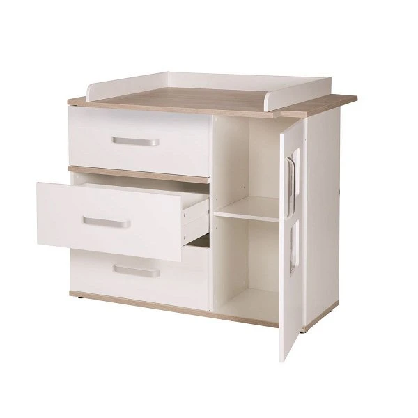 Die Wickelkommode ist mit einem abnehmbaren Wickelansatz ausgestattet. Die 3 Schubladen bieten sehr viel Platz und Stauraum für Windeln und andere Dinge. Der Innenraum hinter der Tür der Kommode ist durch einen Einlegeboden unterteilt. Die integrierten Bilderrahmen können mit persönlichen Fotos bestückt werden und machen die Wickelkommode so zu einem Unikat.