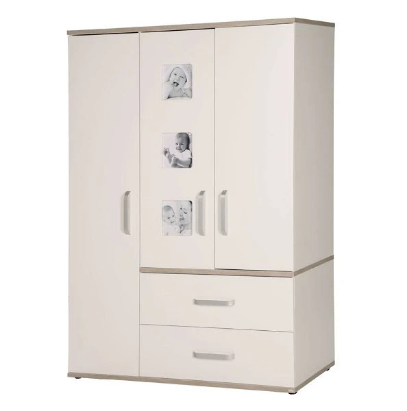 Der Kleiderschrank von Roba ist mit einer großen und zwei kleineren Türen und zwei Schubkästen ausgestattet. Die integrierten Bilderrahmen in der mittleren Tür können mit persönlichen Fotos bestückt werden und machen den Kleiderschrank so zu einem Unikat.