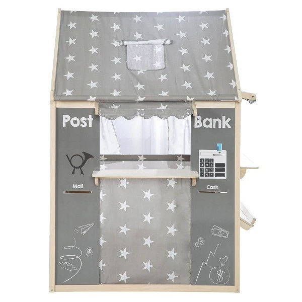 Die Roba Spielhaus Kombination kann wahlweise als Kaufladen mit Theke und Uhr, Schalter für Post, Kiosk oder Bank sowie Kaspertheater mit Vorhang bespielt werden. Jede Seite des Spielhauses hat sein eigenes Thema für eine Erlebniswelt mit zahlreichen Spielmöglichkeiten und ist dazu noch liebevoll bedruckt. Das Spielhaus fördert Kreativität, soziale Interaktion und ist pädagogisch ab 3 Jahren sehr empfehlenswert.