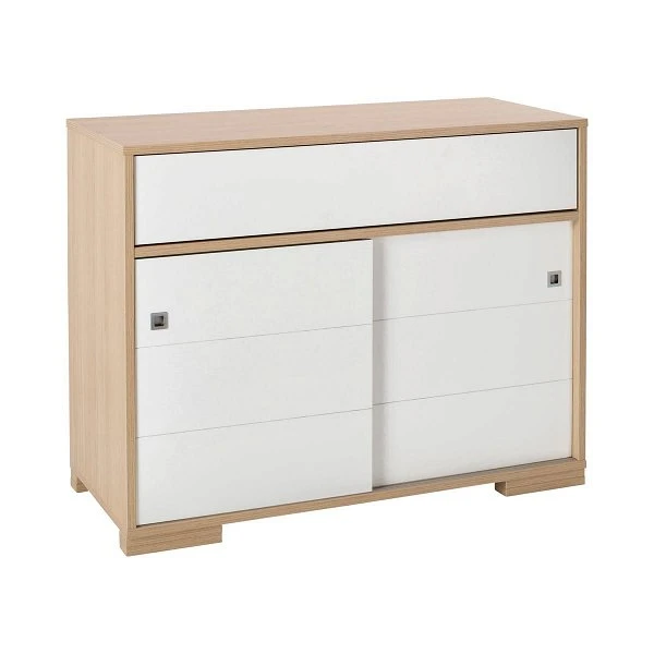 Die Wickelkommode Slide Oak ist mit einem abnehmbaren Wickelaufsatz ausgestattet. So bereitet Ihnen die Kommode auch nach der Wickelzeit noch Freude. Die zwei Schiebetüren mit horizontalen Rillenfräsungen fahren komplett hintereinander durch. Der obere Schubkasten wird mit push-to-open geöffnet und besitzt extra starke seitliche Führungsschienen.
