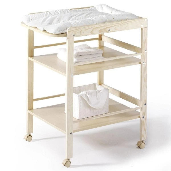 Das Schardt Wickelregal ist aus massiver Kiefer gefertigt. Die 4 praktischen Rollen ermöglichen einen flexiblen Einsatz im ganzen Haus.