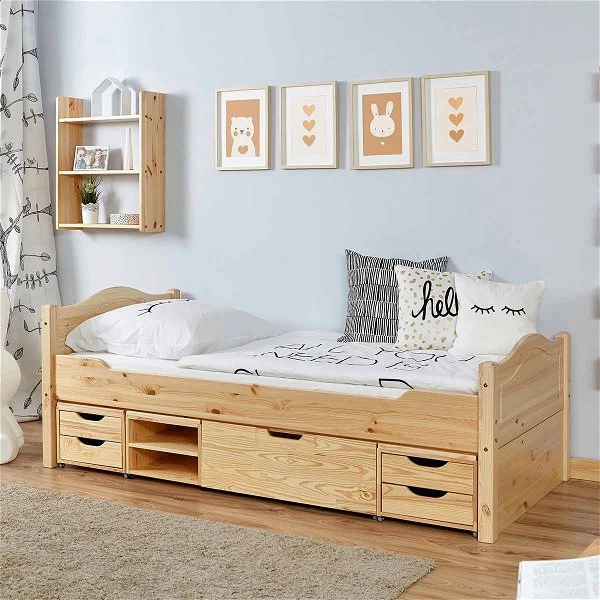 Ticaa Einzelbett Leni mit 4er Funktionsschubkasten Kiefer – 90×200 cm