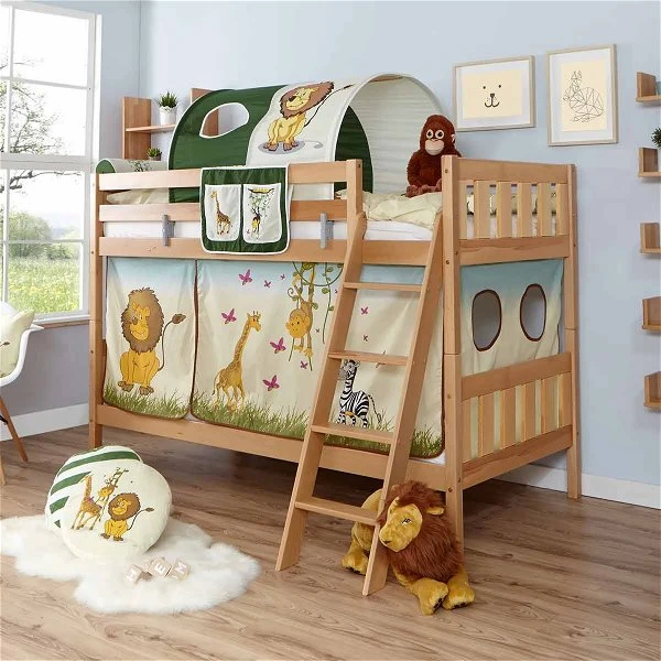 Das Ticaa Erni Etagenbett bietet einen sicheren Schlafplatz auf beiden Ebenen. Es ist aus massiven Buchenholz gefertigt und besitzt oben rundherum einen Fallschutz sowie eine Leiter.