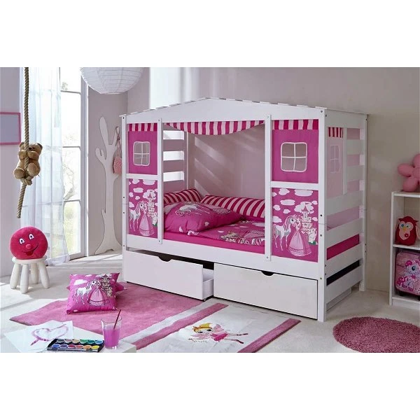 Ticaa Hausbett Horse Rosa Kiefer Weiß inkl. Schubkästen – Dessin: Horse Rosa