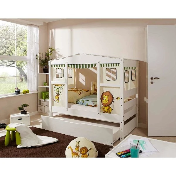 Ticaa Hausbett MINI Safari Kiefer Weiß inkl. Bettkasten – Dessin: Safari