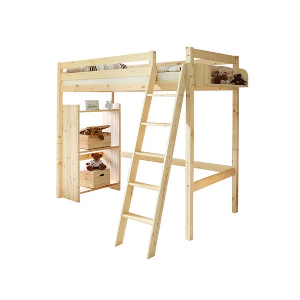 Wunderschönes Hochbett mit Schrägleiter. Der untere Bereich des Ticaa Matthias Hochschläfer kann als Nische und Stauraum genutzt werden, das hoch gelegene Bett lädt zum Träumen ein.