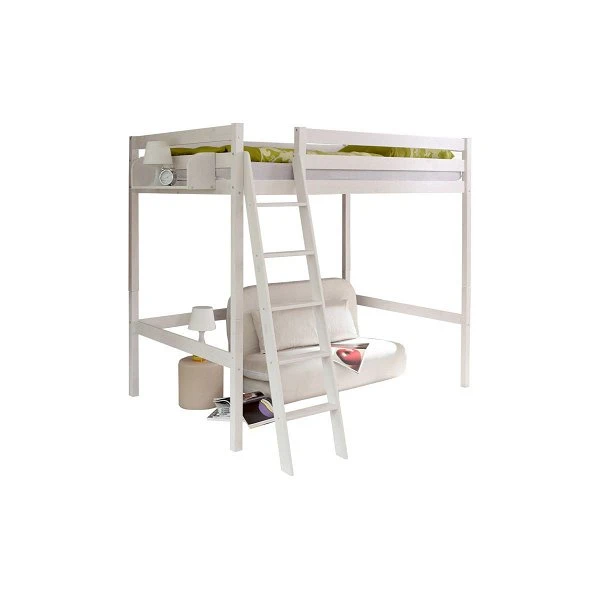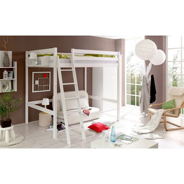 Wunderschönes Hochbett mit Schrägleiter. Der untere Bereich des Ticaa Matthias Hochschläfer Doppelbetts kann als Nische und Stauraum genutzt werden, das hoch gelegene Bett lädt zum Träumen ein.