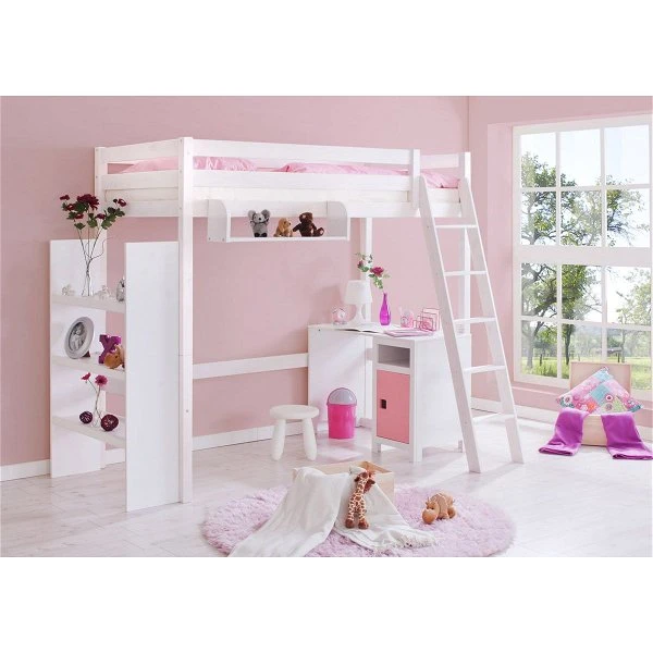 Wunderschönes Hochbett mit Schrägleiter. Der untere Bereich des Ticaa Matthias Hochschläfer kann als Nische und Stauraum genutzt werden, das hoch gelegene Bett lädt zum Träumen ein.