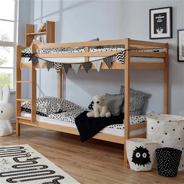 Das Ticaa Rene Etagenbett bietet einen sicheren Schlafplatz auf beiden Ebenen. Es ist aus massiven Buchenholz gefertigt und besitzt oben rundherum einen Fallschutz sowie eine Leiter.