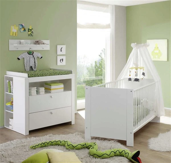 Das trendteam Olivia Sparset ist eine schicke Lösung mit modernem Flair. Das Sparest besteht aus Babybett und Wickelkommode. Eine optimale Robustheit wird durch die Verwendung von Dekorfolie garantiert. Die weiße Front- und Korpusgestaltung schafft ein zeitgemäßes Design, das sich harmonisch in den Raum integriert.