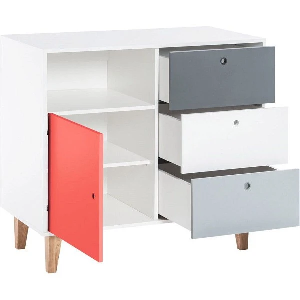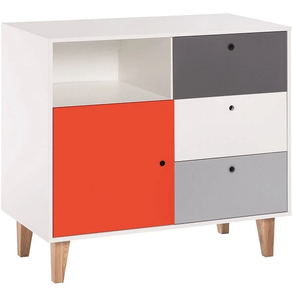Die VOX Concept Baby Kommode ist mit 4 Schubfächern, sowie einem offenen Fach und einer kleinen Tür ausgestattet und bietet viel Platz für Windeln und Pflegemittel.